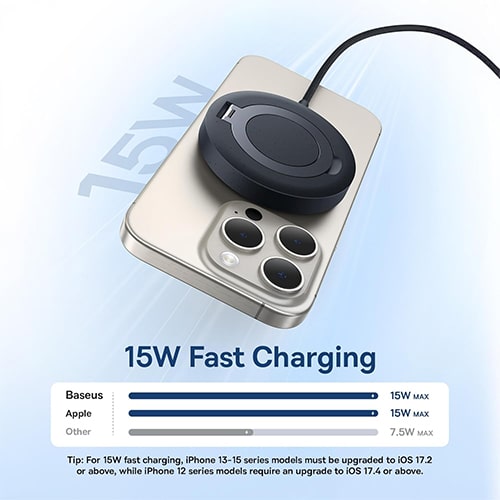 Enhanced Compatibility Works seamlessly with iPhone 12 (max 7.5W) and iPhone 13-15 (max 15W with iOS 17.2 or above) Also supports Android devices with wireless charging capabilities.